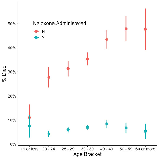 Except for the youngest patients, naloxone sharply attenuated the odds of death and that the effect may be more substantial for older patients.